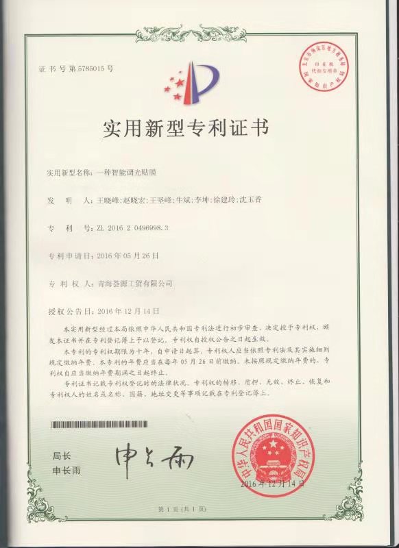 ,并申报了多项专利,在现有产品的基础上升级研发出水墨山水调光玻璃、分段显示调光玻璃、百页窗等智能调光玻璃。
